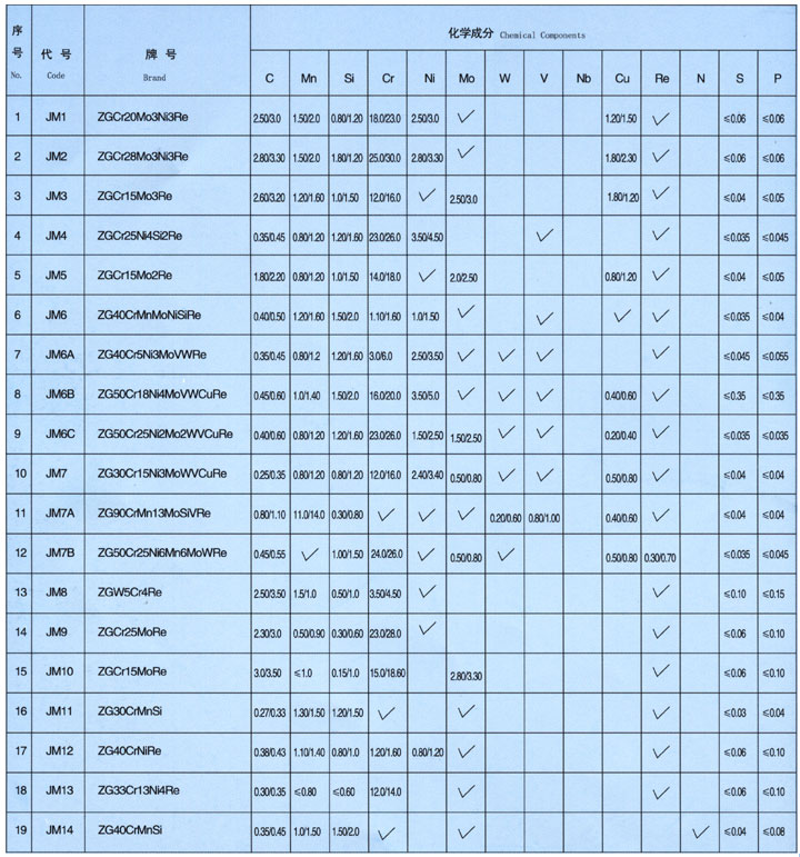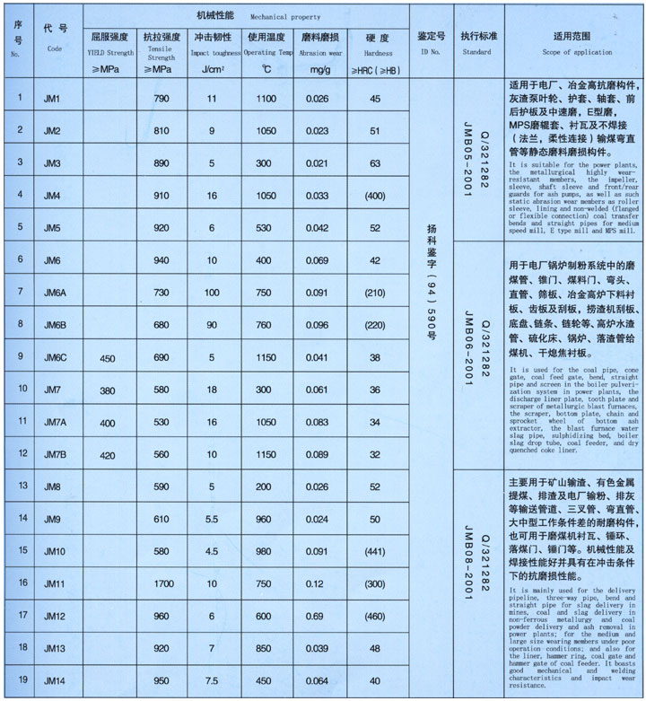 耐磨材料、品质性能表: